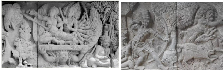 Contoh rupa raksasa pada relief. (kiri) Adegan Rahwana Menculik Sinta Menunggai Raksasa Bersayap pada panil 12 Candi Siwa, Prambanan. (kanan) Adegan Lesmana memanah Kijang Jelmaan Raksasa Kala Marica pada Candi Siwa, Prambanan