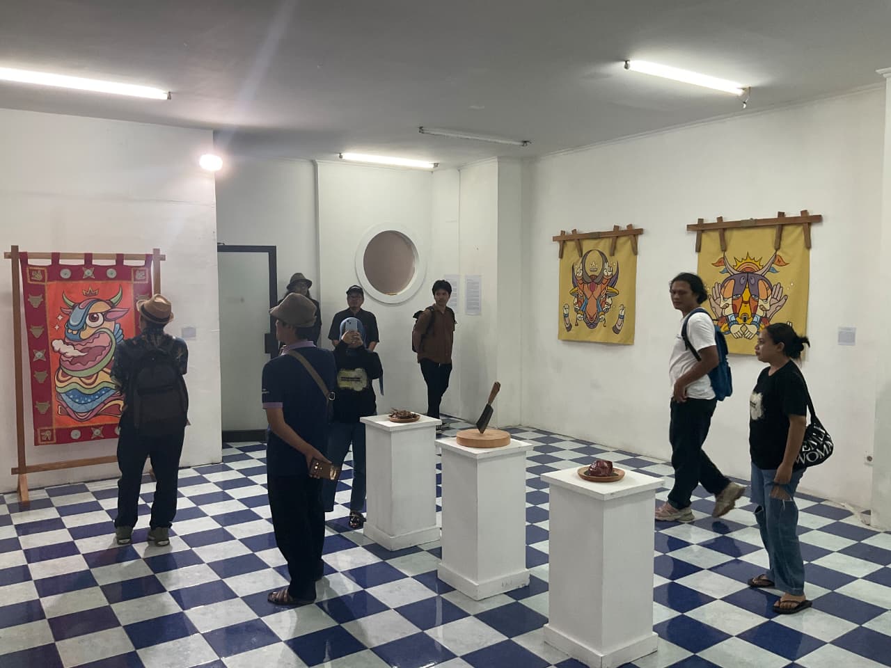 Penggunaan media custom (non-konvensional), sperti gorden, pengonong sapi, kayu, hingga pisau daging, bukan sekadar pilihan estetis, tetapi pernyataan konseptual yang saling terikat. Setiap material dipilih karena kedekatannya dengan tradisi yang diangkat, menciptakan hubungan langsung antara objek fisik dan nilai simbolik. Besutan material bukan hanya perangkai visual, melainkan narator yang menyimpan sejarah, afeksi dan sensibilitas.