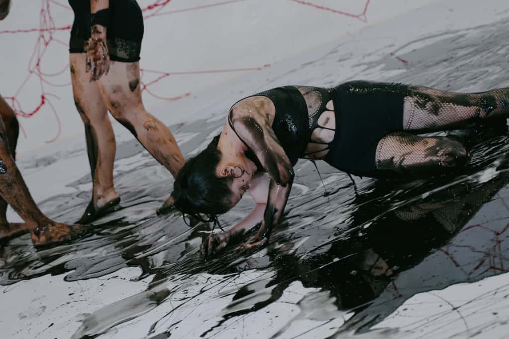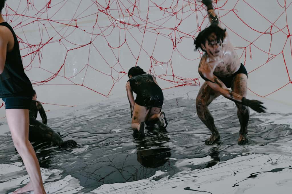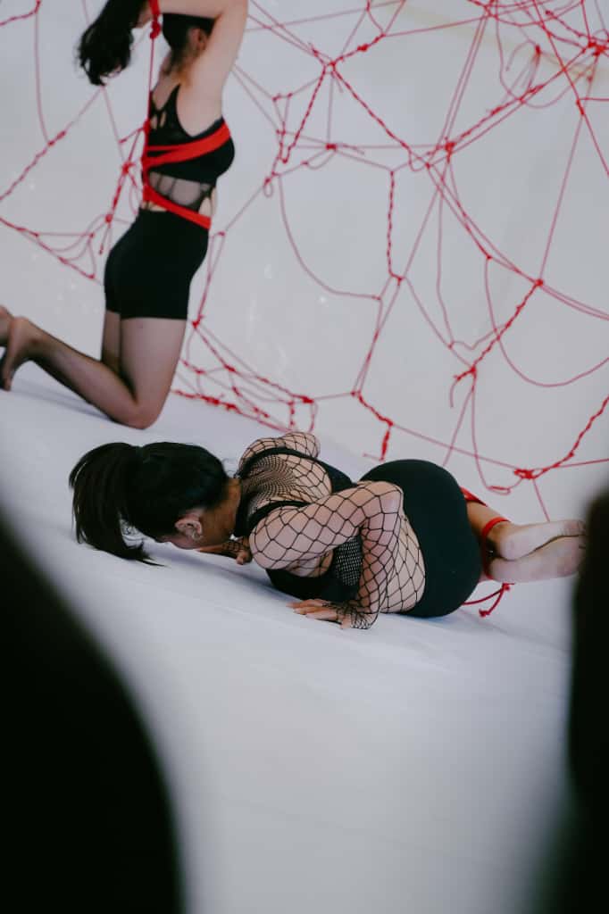 - Instalasi tali (shibari/rope) sebagai medium utama,