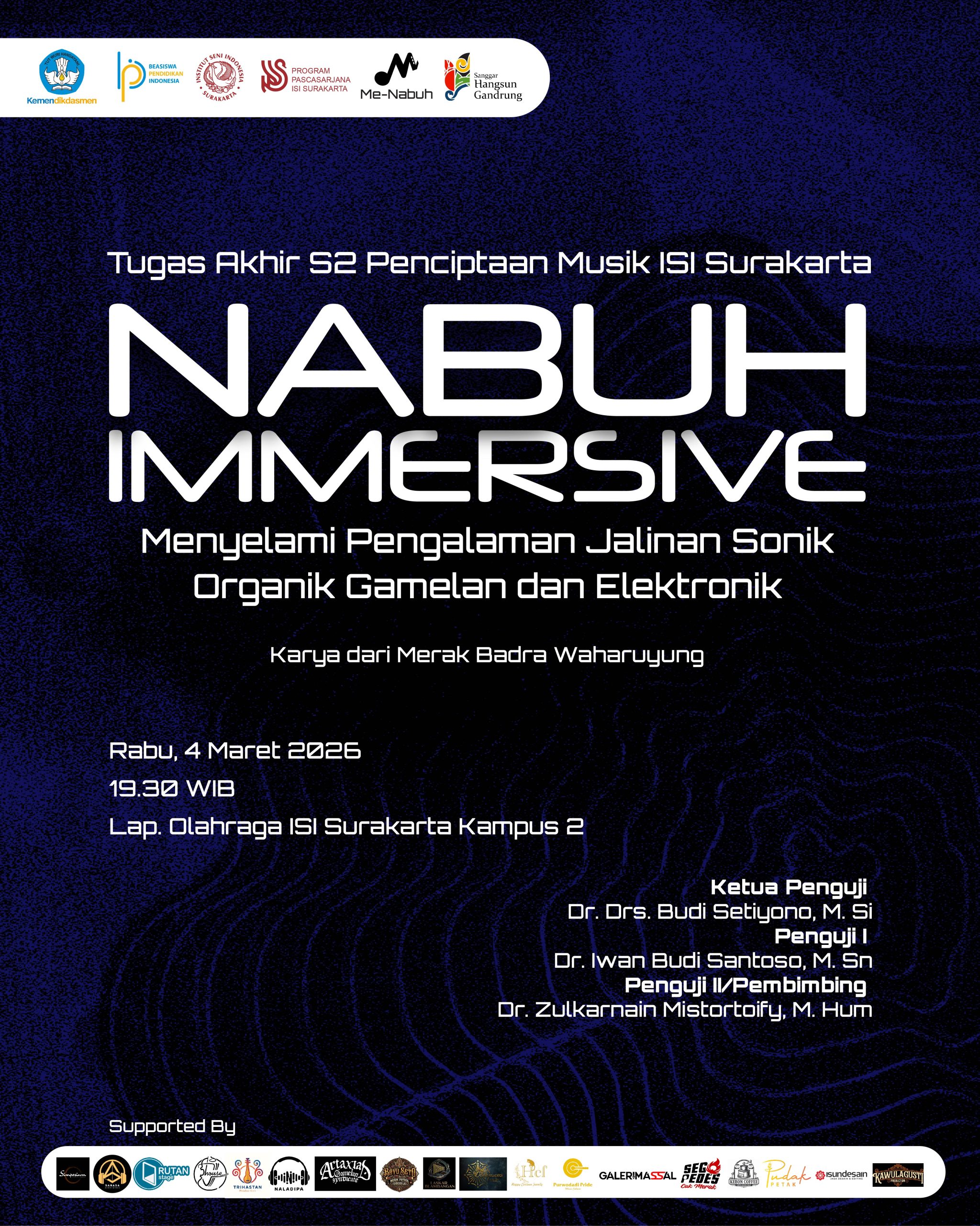 Tugas Akhir S2 Penciptaan Musik ISI Surakarta dari Merak Badra Waharuyung ini mengajak kamu menyelami jalinan sonik organik gamelan yang bertemu dengan eksplorasi elektronik. Tradisi dan teknologi berdialog dalam satu ruang, satu pengalaman, satu getaran.