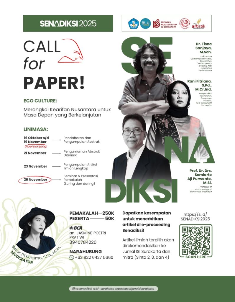 β¨ Artikel terpilih akan diterbitkan di e-proceeding SENADIKSI dan direkomendasikan ke Jurnal ISI Surakarta & mitra (Sinta 2, 3, dan 4).